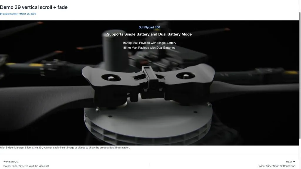 With Swiper Manager Slider Style 29 , you can easily insert image or videos to show the product detail information.